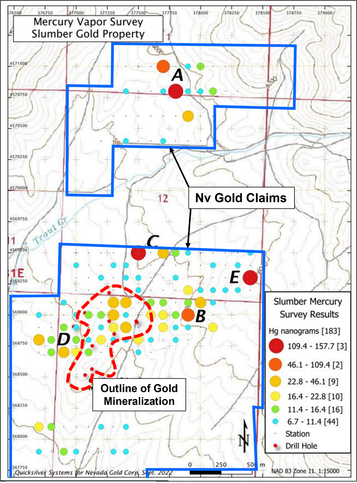 NV Gold has successfully delineated a decent-sized, near-surface, oxide-gold mineralization on its Slumber property in Humboldt County, Nevada. The gold zone is very homogenous and continuous, and preliminary AuCN tests returned high gold recoveries. A 2021 Leapfrog model confirmed expectations to extend the known gold zone and to encounter higher grade gold values to the north. The gold system stays open in multiple directions and at depth, and most of the northern part of the Property and most of the southern part remain untested. However, having mostly gold values of around 0.2 g/t Au compels NV Gold to meet better grades and thicker intercepts! Recently received assays of up to 1.5 g/t Au in SL-27 are indicators that higher grades can be present in the area. Slumber is 80%+ covered by gravel and thick sagebrush vegetation, which made the Company decide to conduct a mercury vapor survey to find any leakage of a larger-sized, concealed gold-system. As a result, the mercury vapor survey has successfully identified five new untested zones (A-E) with potential for better gold grades under gravel cover (see Figure 10). Identifying the higher-grade feeder structures will be critical to enhance the Project to economic mining levels. The Company has already permitted 3 drill sites to follow-up on the mercury vapor targets, which are standing by to be drill-evaluated in mid to late 2023 depending on financing and drill rig availability.