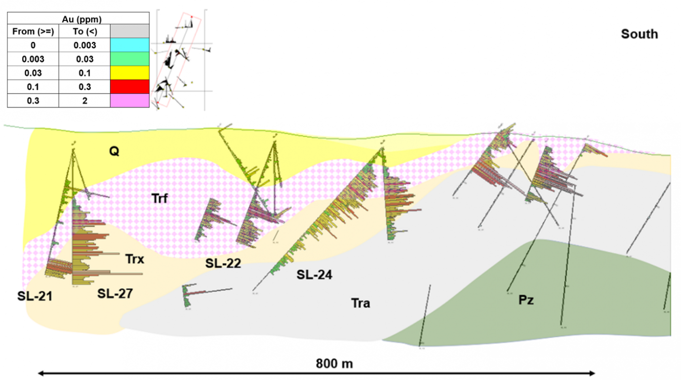Figure 4 – Cross-section A-A’ with gold intercepts on interpreted geology.